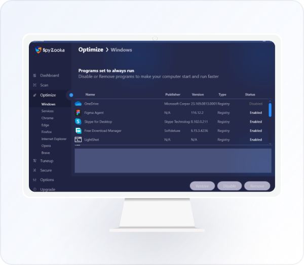 Programs run silently in the background slowing down your computer and internet. SpyZooka’s Optimizer makes it easy to speed up your computer and internet by disabling programs that startup in Windows, Edge, Chrome, Firefox, Opera, Brave and Internet Explorer.